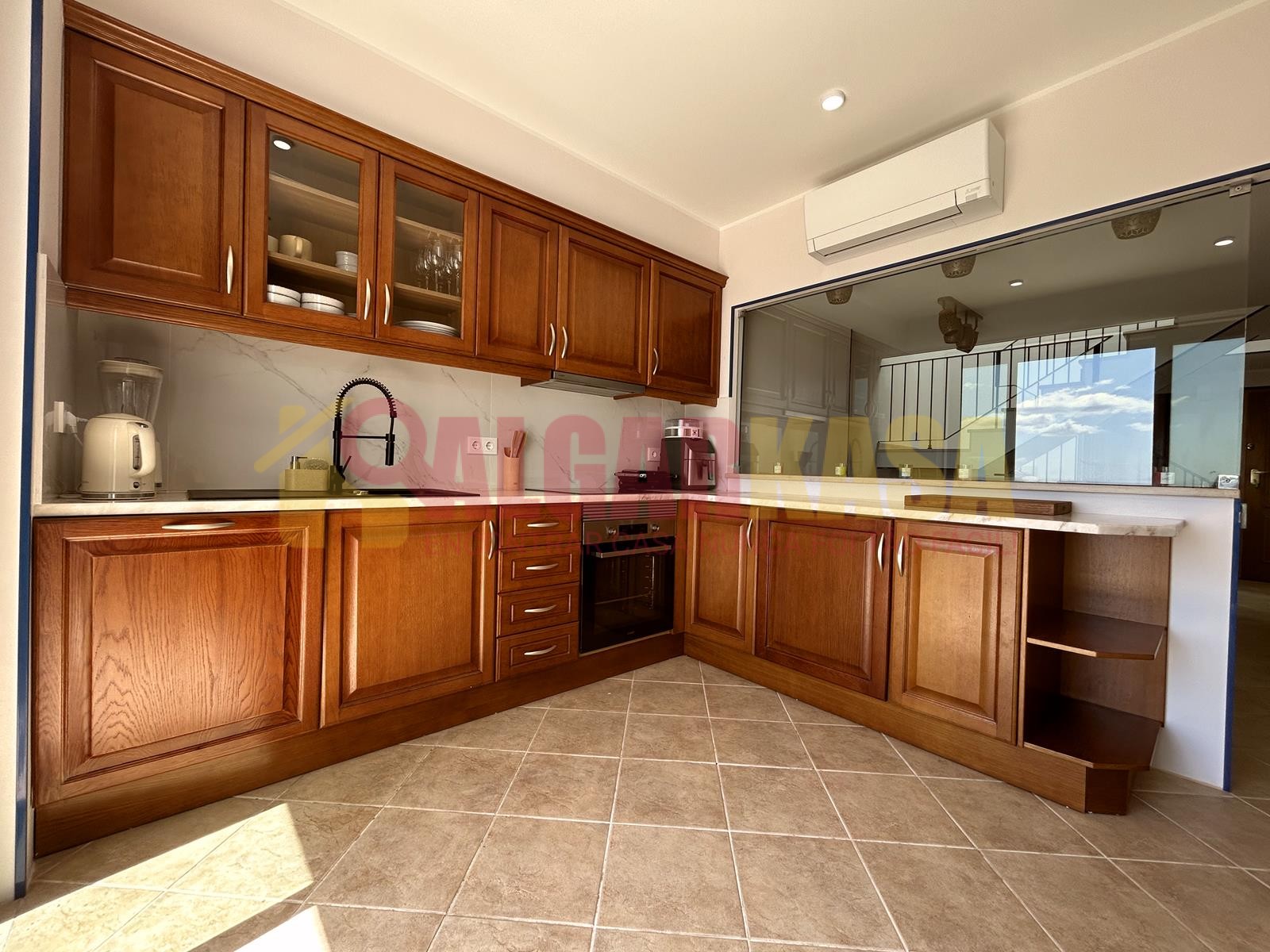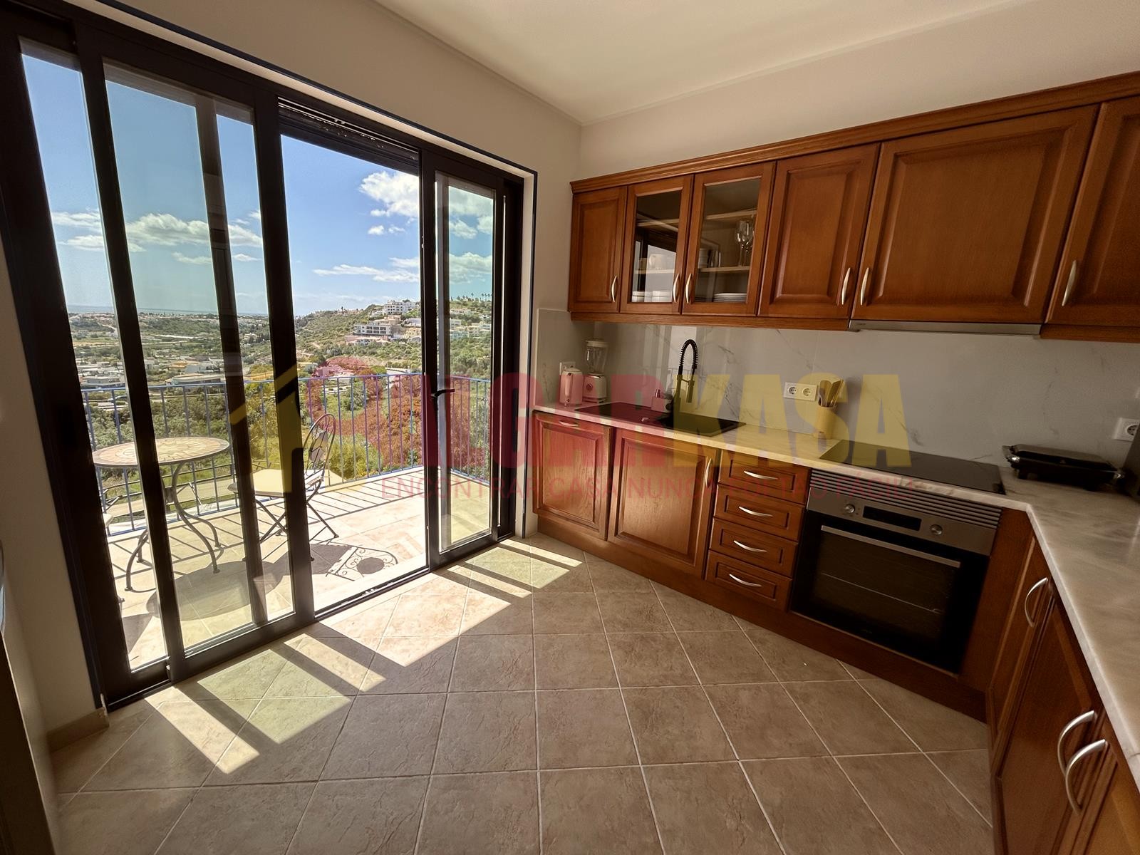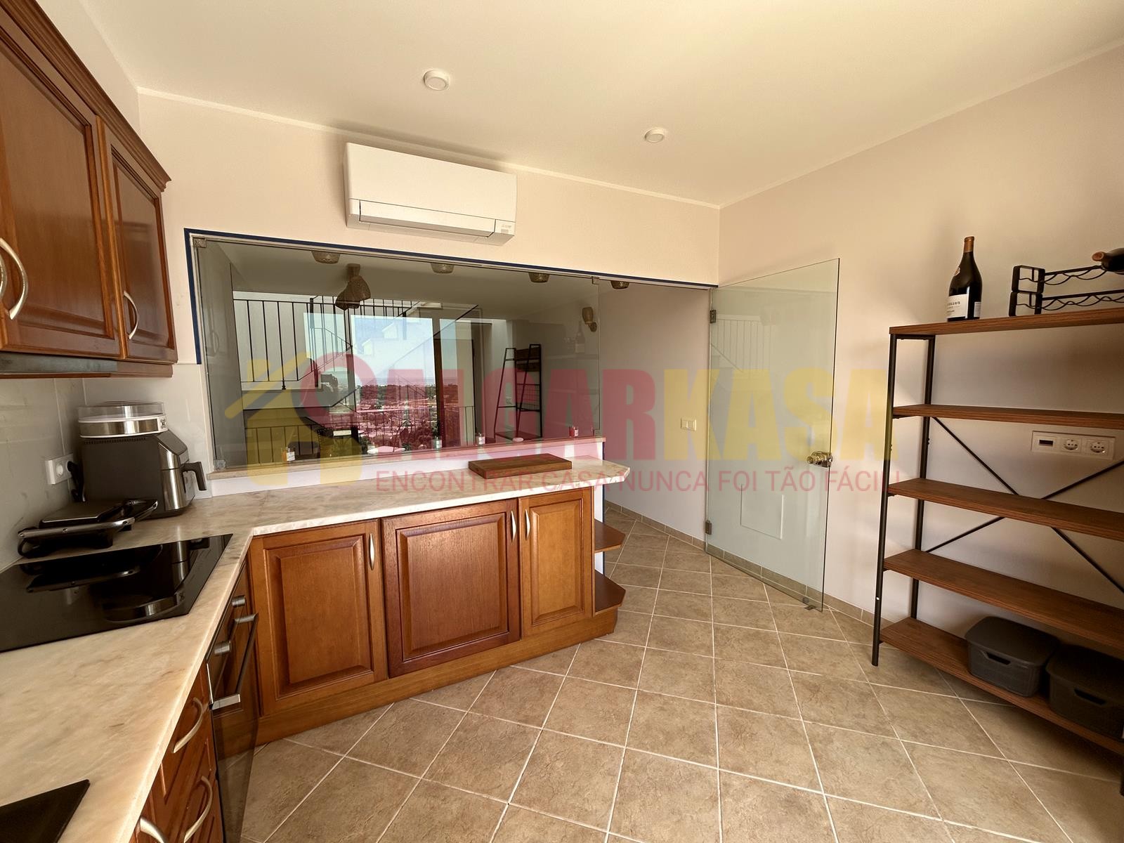 Cozinha totalmente equipada (forno, micro-ondas, fogão, frigorífico com congelador, máquina de lavar loiça, máquina de lavar roupa, ferro, tábua de engomar, máquina de café, jarro elétrico, varinha mágica, etc.).